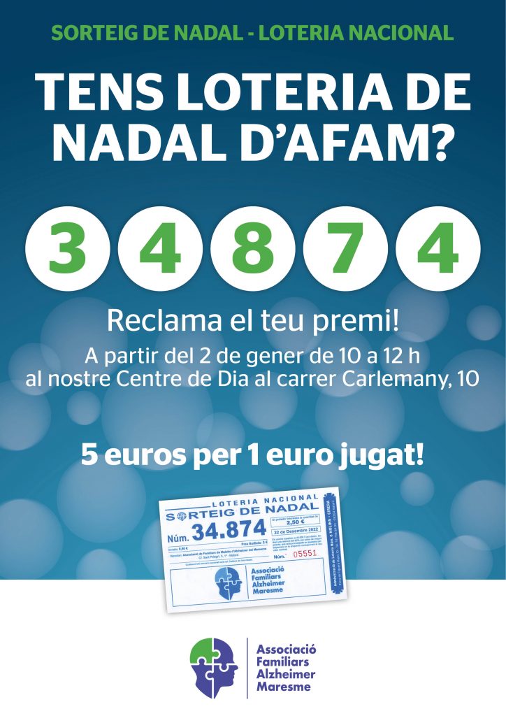 Tens una participació de la loteria de Nadal de l’AFAM? Enhorabona! El premi que has obtingut per cada euro jugat són 5 euros que t’emportes!