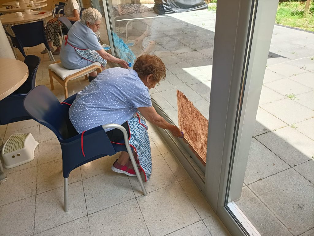 Un dels grups del Centre de Dia està treballant amb entusiasme en la decoració dels vidres del centre. Utilitzant pintures especials, els participants han traslladat l’essència de l’estiu a aquest espai.