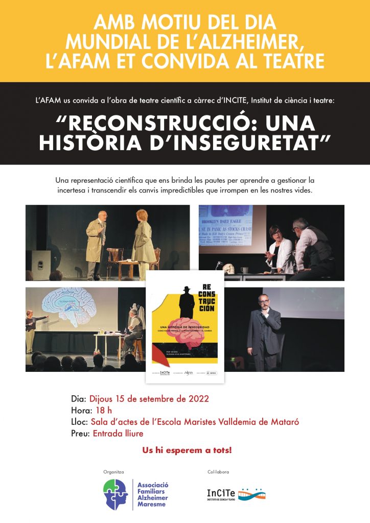 Amb motiu del Dia Mundial de l’Alzheimer, l’AFAM et convida al teatre, a la representació cient´ífica RECONSTRUCCIÓ :UNA HISTÒRIA D’INSEGURETAT, a càrrec d’ INCITE. L’obra tindrà lloc el proper 15 de setembre de 2022 a la sala d’actes de l’Escola Maristes Valldemia de Mataró.