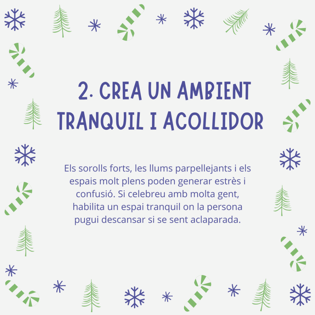 Els sorolls forts, les llums parpellejants i els espais molt plens poden generar estrès i confusió. Opta per una decoració discreta i un ambient relaxat. Si celebreu amb molta gent, habilita un espai tranquil on la persona pugui descansar si se sent aclaparada.