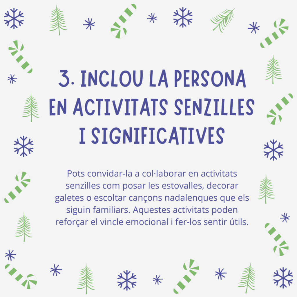 Encara que les capacitats canviïn, hi ha moltes maneres de participar. Pots convidar-los a col·laborar en activitats senzilles com posar les estovalles, decorar una galeta o escoltar cançons nadalenques que els siguin familiars. Aquestes activitats poden reforçar el vincle emocional i fer-los sentir útils.
