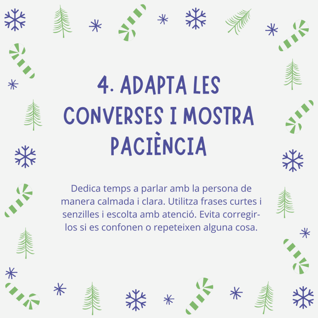 Durant les trobades familiars, dedica temps a parlar amb la persona de manera calmada i clara. Utilitza frases curtes i senzilles i escolta amb atenció. Evita corregir-los si es confonen o repeteixen alguna cosa; el més important és la connexió emocional.