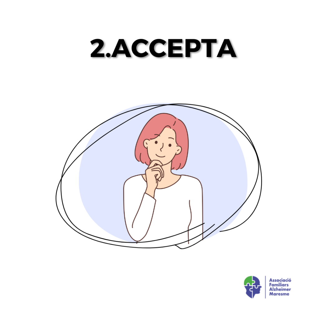 Que la malaltia és progressiva i que les habilitats de la persona afectada canviaran amb el temps. Ajusta les teves expectatives i adapta les activitats diàries que duies a terme segons les capacitats i necessitats de la persona afectada. Has d’anar acceptant totes les fases per les quals el familiar afectat anirà passant, a mesura que l’Alzheimer vagi evolucionant.