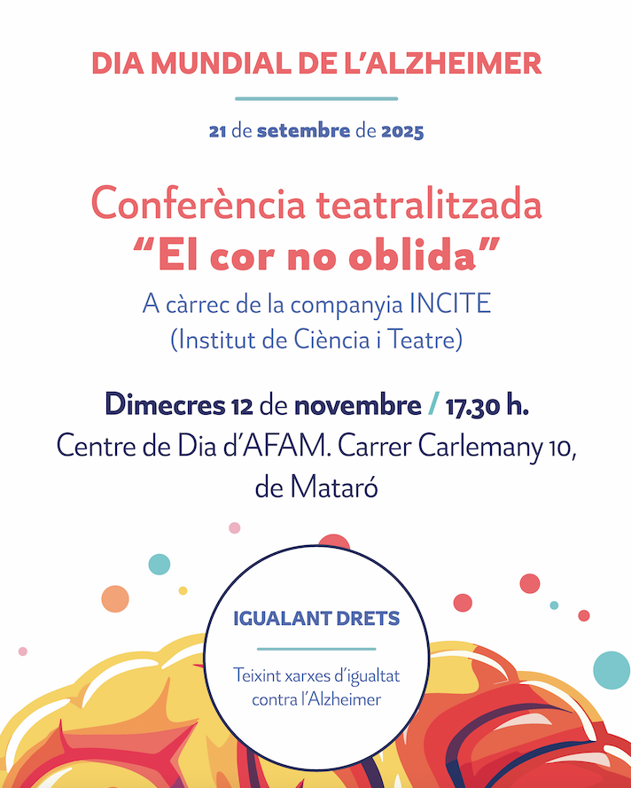 El proper dimecres 12 de novembre a les 17.30 h, el Centre de Dia d’AFAM acollirà una proposta única que combina teatre i ciència: “El cor no oblida”, a càrrec de la companyia INCITE (Institut de Ciència i Teatre).