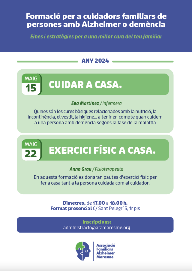 Durant el mes de maig, us podeu apuntar a dues formacions: “Cuidar a casa”, a càrrec de la nostra infermera, Eva Martínez, que ens parlarà sobre quines són les cures bàsiques relacionades amb la nutrició, la incontinència, el vestit i la higiene…
