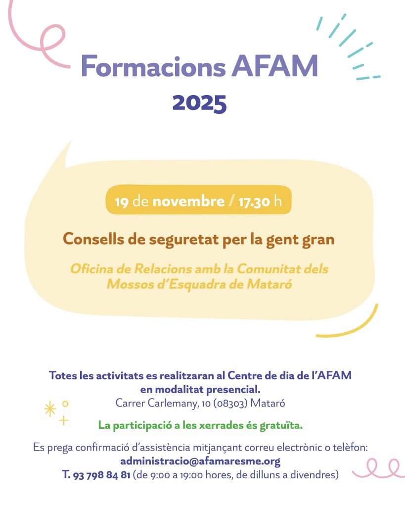 El proper 19 de novembre, l’AFAM ofereix una nova sessió formativa gratuïta a càrrec del Mossos d’Esquadra de Mataró, que ens oferiran consells de seguretat per a les persones amb Alzheimer o demència i per a la gent gran en general.