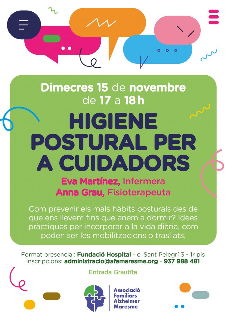 Dimecres, 15 de novembre, oferim un taller sobre Higiene postural per a cuidadors i cuidadores a càrrec d’Eva Martínez, infermera d’AFAM i Anna Grau, Fisoterapeuta d’AFAM.