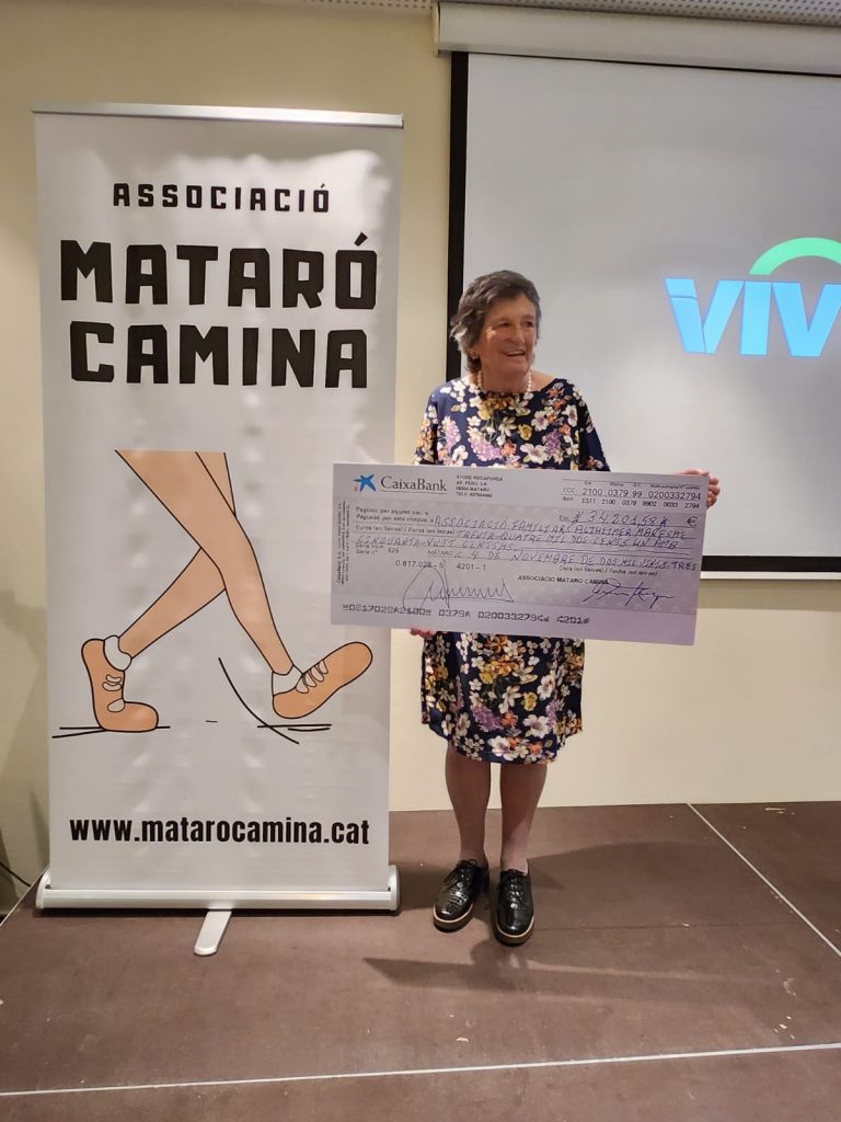 El passat divendres, 3 de novembre, en un acte organitzat a l’hotel @spahotelateneaport de Mataró, vam recollir el xec de 34.201,58 € dels beneficis de la XVI Mataró Camina per l’Alzheimer. La Presidenta d’AFAM, Ma Àngels Fradera, va ser l’encarregada de recollir el xec de mans de Josep Ma Spà, President de l’Associació Mataró Camina, que des de fa setze anys organitza una caminada solidària en benefici de l’AFAM.