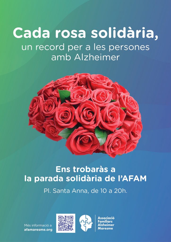 Des de l’AFAM et recordem que el 23 d’abril, diada de Sant Jordi, ens trobareu a la parada de roses solidàries destinades a les famílies que pateixen la malaltia de l’Alzheimer o alguna altra demència.