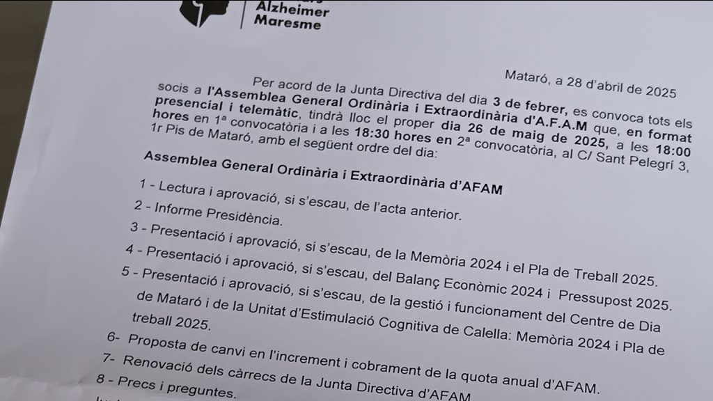 El dia 26 de maig va tenir lloc l’Assemblea General de l’Associació de Familiars de persones amb Alzheimer i altres demències del Maresme (AFAM) a la Fundació Hospital, carrer Sant Pelegrí 3, a Mataró.